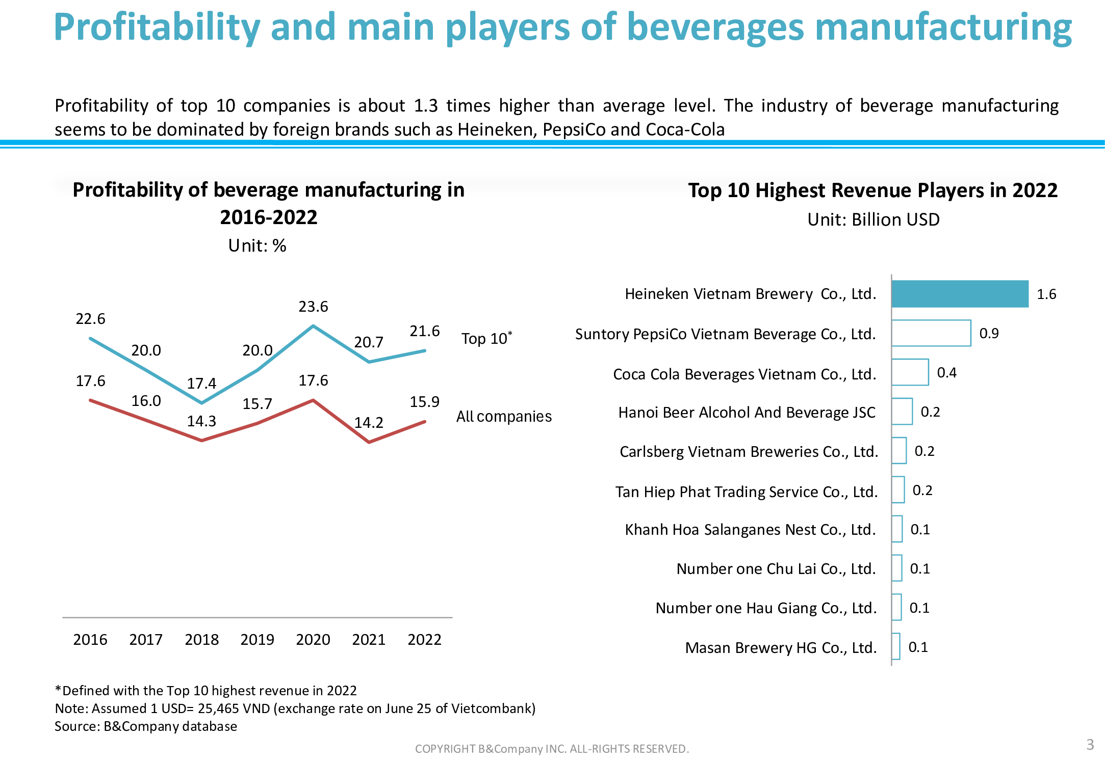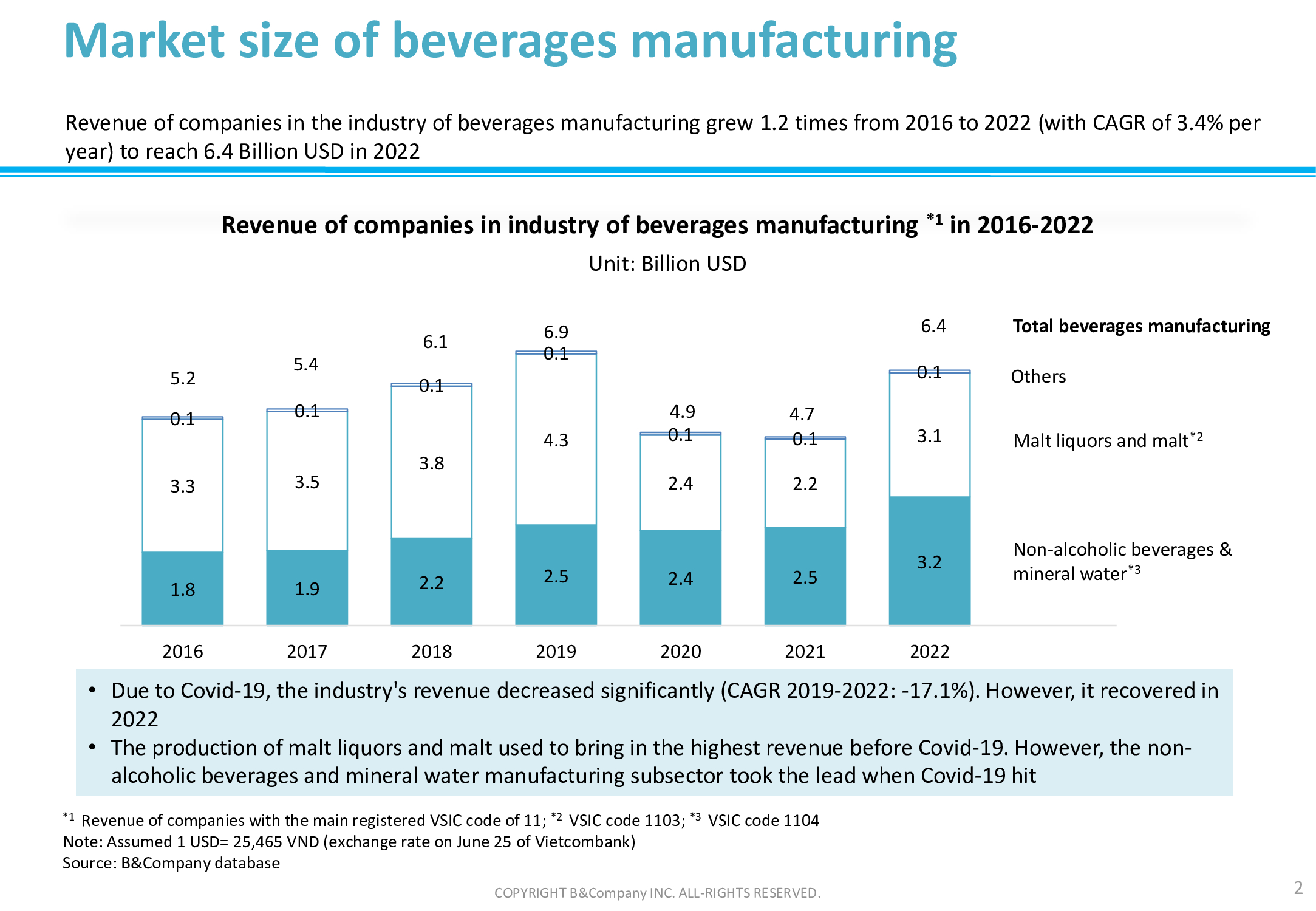 B&Company 데이터베이스를 기반으로 음료 제조 보고서 2016-2022년의 시간 범위로 베트남에서. 자세한 내용은 아래를 참조하세요.